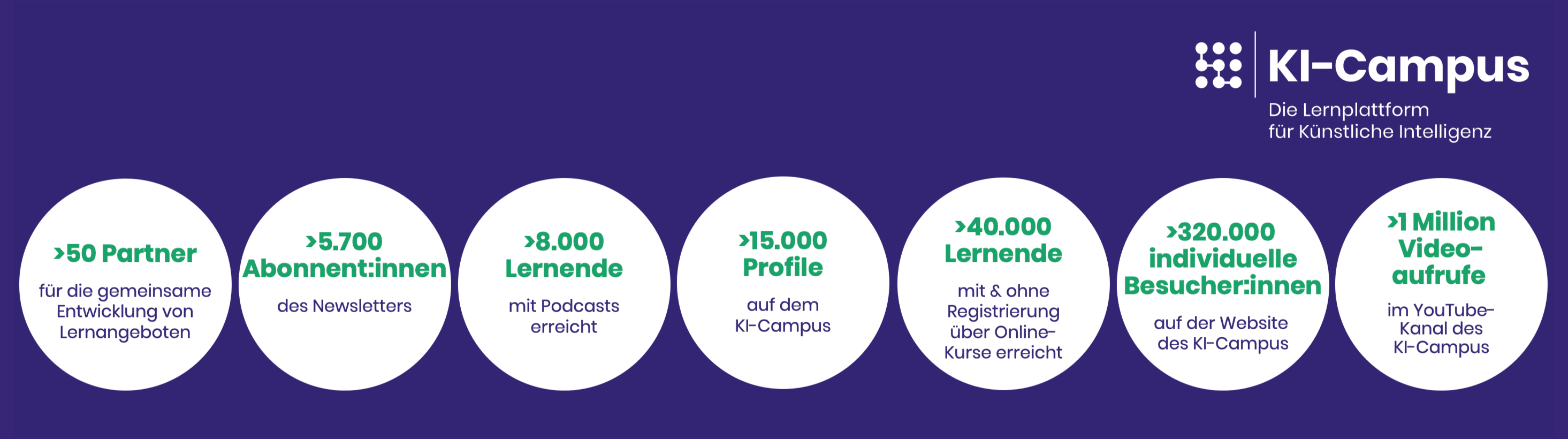 „Der KI-Campus ist die Lernplattform für Künstliche Intelligenz mit kostenlosen Online-Kursen, Videos und Podcasts zur Stärkung von KI- und Datenkompetenzen. Als Forschungs- und Entwicklungsprojekt wird der KI-Campus vom Bundesministerium für Bildung und Forschung (BMBF) gefördert. Seit 2019 entwickeln den KI-Campus – gemeinsam mit zahlreichen Partnern – der Stifterverband, das Deutsche Forschungszentrum für Künstliche Intelligenz (DFKI), das Hasso-Plattner-Institut (HPI), NEOCOSMO und das mmb Institut.“