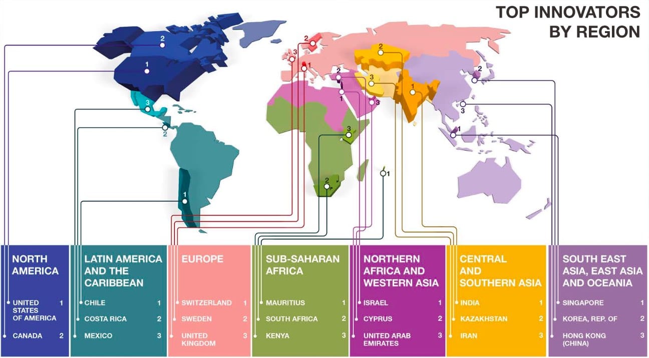 Wer die innovativsten Player in ihrer Region sind, zeigen folgende Darstellungen. Weltweit gesehen überraschen Länder wie die USA, Kanada, Korea, China nicht wirklich, andere Länder wie Mauritius, Kenia oder Kasachstan dagegen schon eher.