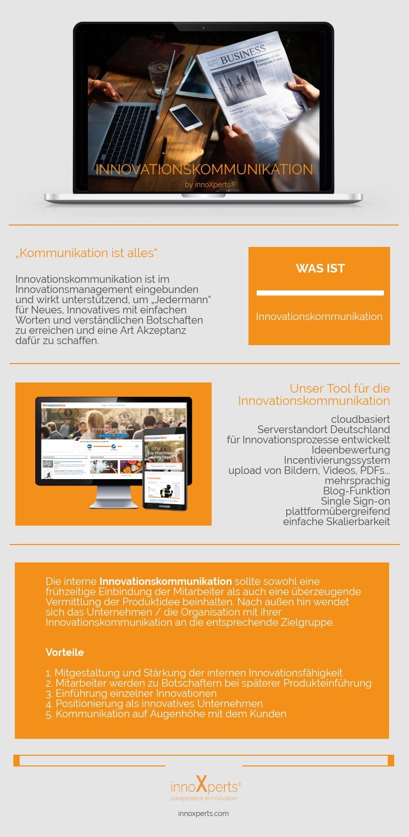 Innovationskommunikation ist im Innovationsmanagement eingebunden und wirkt unterstützend, um „Jedermann“ für Neues, Innovatives mit einfachen Worten und verständlichen Botschaften zu erreichen und Akzeptanz für Erneuerung zu schaffen.