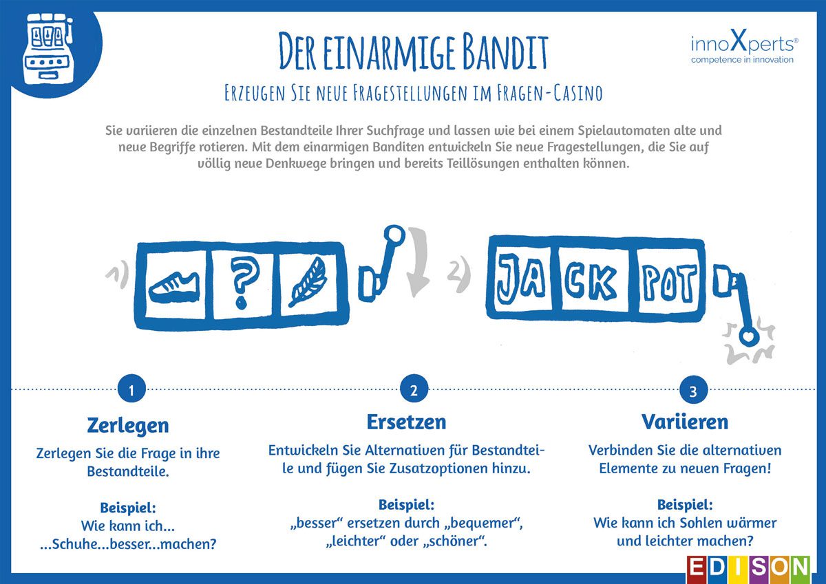 Als Innovationsagentur setzen wir in den Innovationsprojekten mit unseren Kunden die Methoden aus dem EDISON-Prinzip® ein. Mit dieser Sammlung von Werkzeugen für die systematische Ideenentwicklung nutzen wir eine zielgerichtete Methodik, die dem Zweck dient: Wir wollen ein Problem lösen. Die Edison-Toolbox basiert auf der Philosophie, dass wir nicht viele Ideen brauchen, sondern die „RICHTIGEN“, um eine Aufgabenstellung zu lösen.