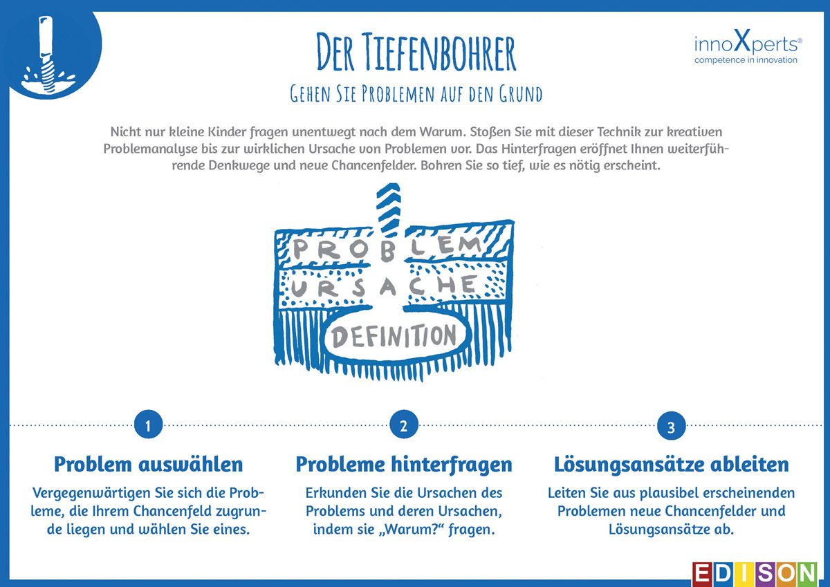 Um Problemen auf den Grund zu gehen, nutzt das Team von innoXperts® den Tiefenbohrer, eine Interviewmethode aus dem EDISON-Prinzip®. Die Anwendung ist ganz einfach: Der Interviewpartner wird immer wieder nach dem „Warum“ gefragt. Er oder sie wird irgendwann „genervt“ sein, aber nur so dringt man bis in die Tiefe zu den wertvollen Antworten durch. Dort stößt man auf den gesuchten Schatz: die wahren Bedürfnisse der Kunden.