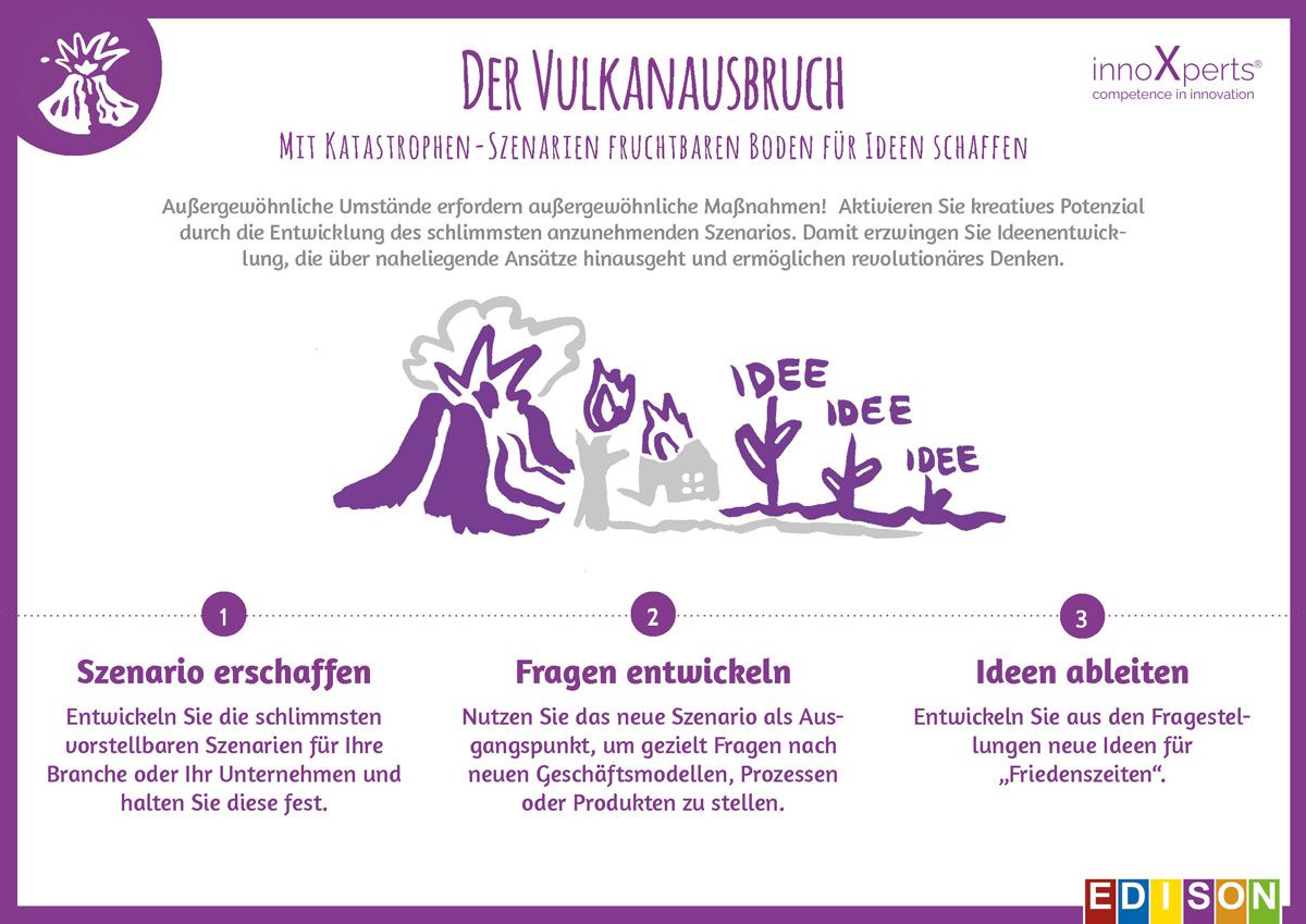 Beim Einsatz dieser radikalen Methode aus dem EDISON-Prinzip® geben Sie Ihrem Team eine Extremsituation vor (z. B. Pandemie, Krieg, starke Preissteigerung bei den Rohstoffen, Gesetzesänderungen oder eben ein Vulkanausbruch). Die Teilnehmer an dieser Runde stellen sich das Szenario vor: Nichts ist mehr so, wie es einmal war. Alles muss radikal neu gedacht werden.