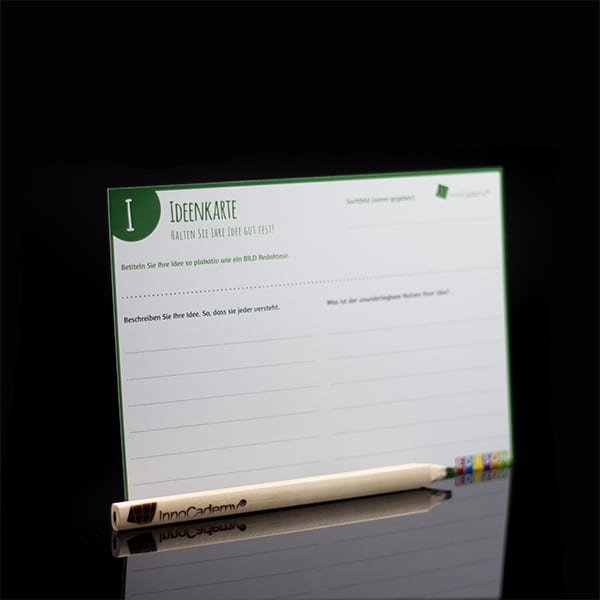 Die Ideenkarte ist das grundlegende Werkzeug bei der Ideenentwicklung. Auf der Ideenkarte haben Sie Platz für einen aussagekräftigen Titel, eine Kurzbeschreibung und erste Gedanken über den Nutzen Ihrer Idee. Mit der Ideenkarte machen Sie Ideen sichtbar und verständlich. Sie empfiehlt sich für den Einsatz im Tagesgeschäft ebenso wie für alle Gelegenheiten, die Sie inspirieren, wie z.B. Besprechungen, Meetings, Telefongespräche, Videokonferenzen oder Workshops.