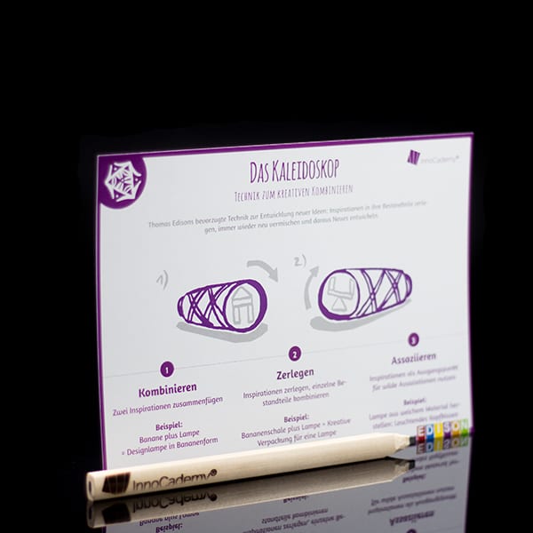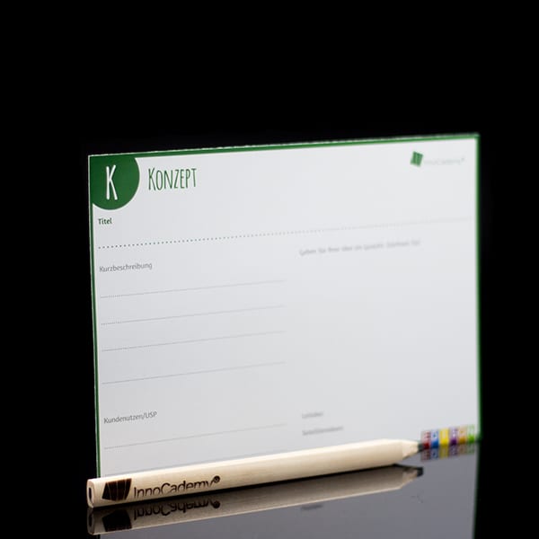Die Materialien sind bei Auswahl von „InnoCademy® Design“ mit unserem InnoCademy® Logo gebrandet. Wählen Sie bei der Bestellung „Customized Design“, so erstellen wir die Kiste, Stifte, Schnitzmesser, Spielkarten und Methodenkarten mit Ihrem Unternehmenslogo.