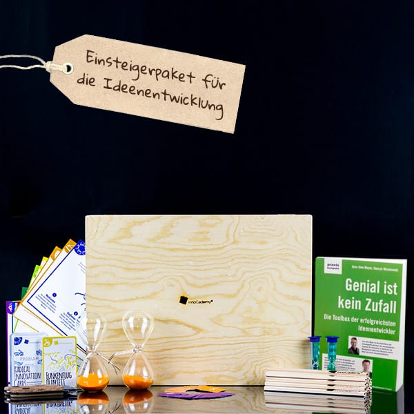 Von der Ideenkarte, ausgewählten Methodenkarten über Stifte, Sanduhren und Bewertungspunkte bis hin zum Buch „Genial ist kein Zufall“ und Workshop-Tools zur Inspiration ist alles dabei. Verpackt in der stabilen, nachhaltigen Holzkiste, haben Sie das komplette Material für Ihren Innovationsworkshop zusammen in einer Box.