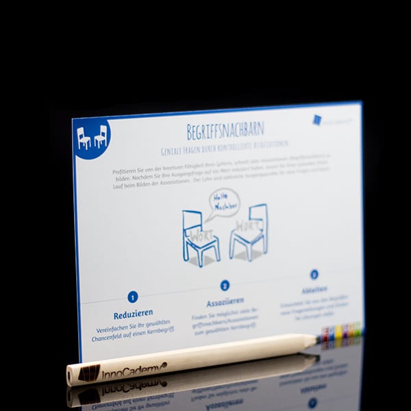Sie erhalten einen Satz Methodenkarten à 20 Stück für die Technik „Begriffsnachbarn“ aus der Edison-Toolbox. Auf jeder Karte finden Sie eine Kurzanleitung. Format: DIN A5, 250 g Karton, matt. Das Buch „Genial ist kein Zufall“ zur Edison-Toolbox können Sie hier bestellen.