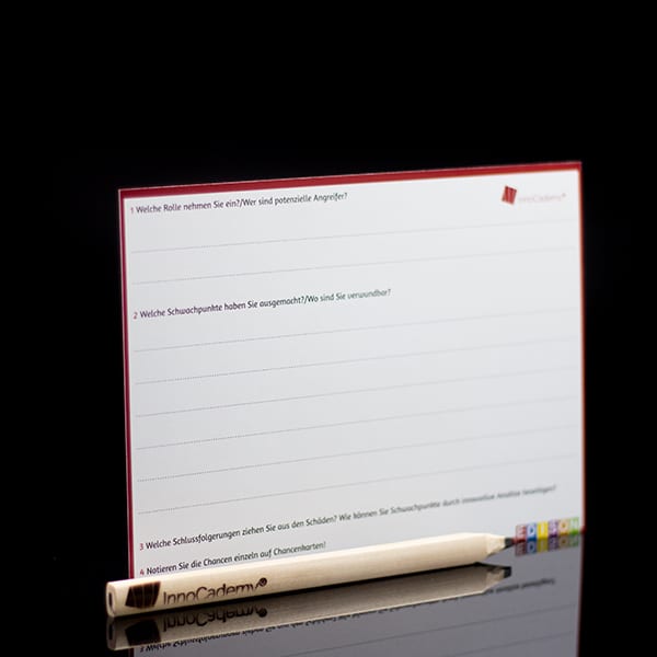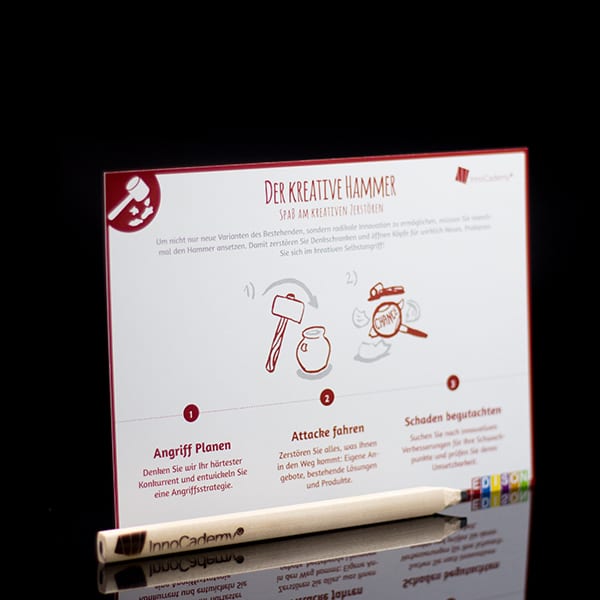 Der kreative Hammer macht Sie zum/zur aggressiven Zerstörer*in. Greifen Sie sich selbst oder bereits bestehende Lösungen an! Mit dieser Methode und dem Spaß am Zerstören legen Sie Ihre eigenen Schwächen schonungslos offen und öffnen Denkschranken.