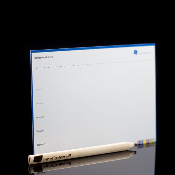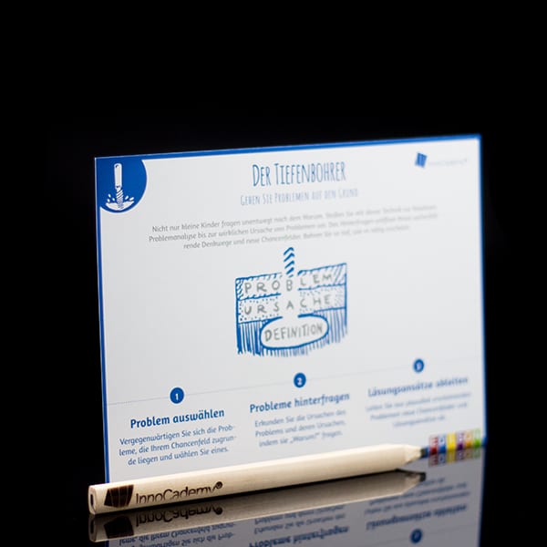 Sie erhalten einen Satz Methodenkarten à 20 Stück für die Technik „Der Tiefenbohrer“ aus der Edison-Toolbox. Auf jeder Karte finden Sie eine Kurzanleitung. Format: DIN A5, 250 g Karton, matt.