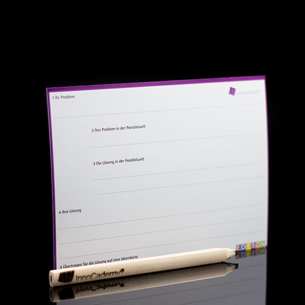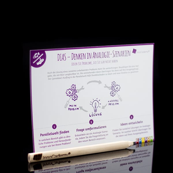 Sie erhalten einen Satz Methodenkarten à 20 Stück für die Technik „DIAS – Denken in Analogie-Szenarien“ aus der Edison-Toolbox. Auf jeder Karte finden Sie eine Kurzanleitung. Format: DIN A5, 250 g Karton, matt.