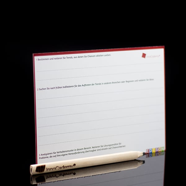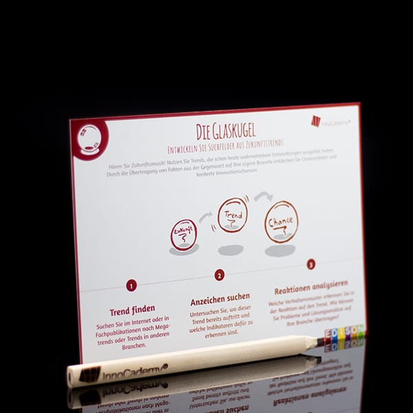 Sie erhalten einen Satz Methodenkarten à 20 Stück für die Technik „Die Glaskugel“ aus der Edison-Toolbox. Auf jeder Karte finden Sie eine Kurzanleitung. Format: DIN A5, 250 g Karton, matt.