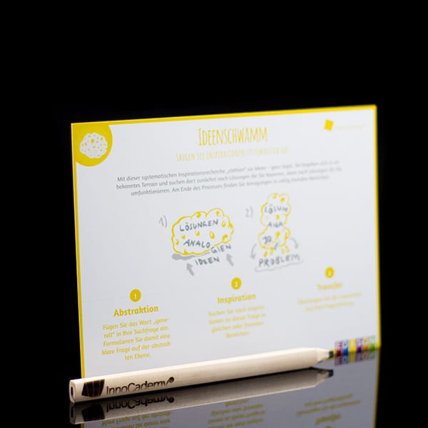 Sie erhalten einen Satz Methodenkarten à 20 Stück für die Technik „Ideenschwamm“ aus der Edison-Toolbox. Auf jeder Karte finden Sie eine Kurzanleitung. Format: DIN A5, 250 g Karton, matt.