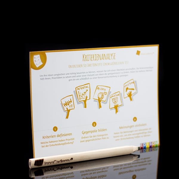 Sie erhalten einen Satz Methodenkarten à 20 Stück für die Technik „Kriterienanalyse“ aus der Edison-Toolbox. Auf jeder Karte finden Sie eine Kurzanleitung. Format: DIN A5, 250 g Karton, matt.