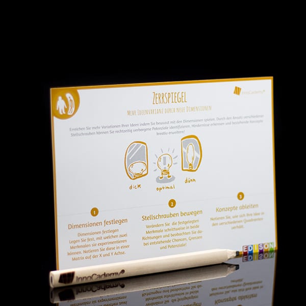 Sie erhalten einen Satz Methodenkarten à 20 Stück für die Technik „Zerrspiegel“ aus der Edison-Toolbox. Auf jeder Karte finden Sie eine Kurzanleitung. Format: DIN A5, 250 g Karton, matt.
