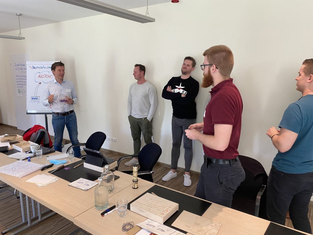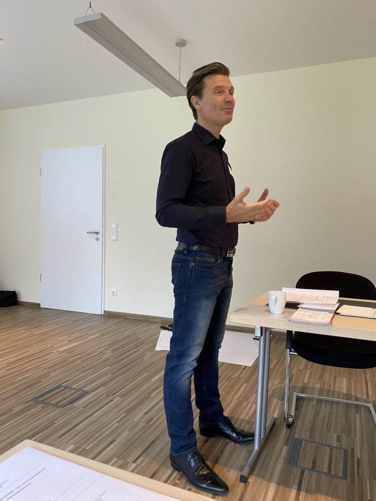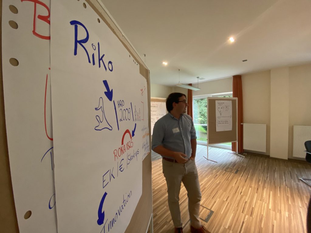 Eine sehr sportliche Woche. Normalerweise gibt es zwischen dem Methoden- und dem Moderationstraining eine Pause von vier bis fünf Tagen. Mit der OSPA-Gruppe waren wir zwei Tage auf Gut Gremmelin für das Methodentraining. Danach ging es für die Mitarbeiterinnen und Mitarbeiter für einen Tag an die ganz normale Arbeit. Am nächsten Tag machten wir mit dem Moderationstraining für Offline-Events weiter. Den Tag darauf ging es an das Backend von OSPA Ideas, so dass die zukünftigen Internen Ideentrainerinnen und Ideentrainer Online-Ideenkampagnen selbstständig moderieren und auch das Backend der Plattform managen können. Also volles Programm. Seit über zehn Jahren bilde ich Interne Ideentrainer aus. So ein hohes Maß an intrinsischer Motivation habe ich allerdings selten erlebt. Sogar zwischen den Tagen ging es in der WhatsApp-Gruppe rund. Vielleicht lag es mit an der Corona-bedingten Wartezeit, dass die Leute so heiß auf die Ausbildung waren. Jedenfalls hatten wir viel Spaß beim Lernen, beim gemeinsamen Entwickeln und auch beim Drei-Gänge-Menü, das wir zusammen gekocht haben. Mit so einer außergewöhnlich hoch motivierten Gruppe zu arbeiten, ist für mich eine tolle Erfahrung. Natürlich wollte ich auch wissen, wie es für die Teilnehmerinnen und Teilnehmer war. Deshalb haben wir mit ihnen Interviews geführt, die es hier zu hören und zu sehen gibt.