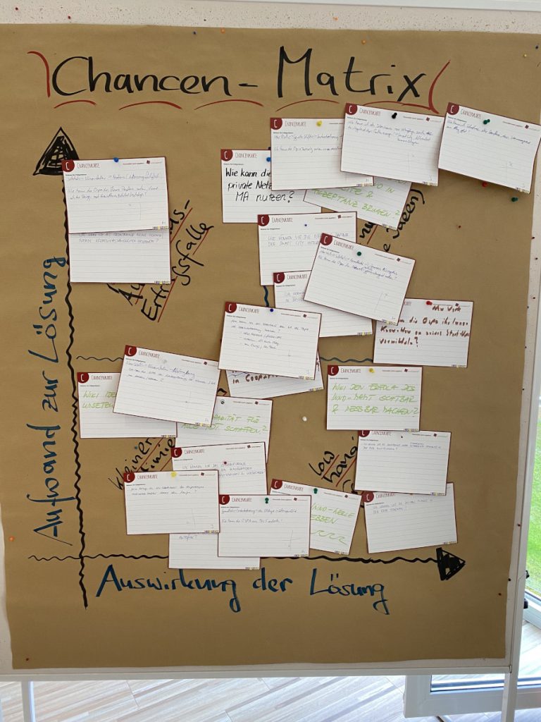 Während des darauffolgenden Innovationsworkshops (InnoCamp®) schufen Führungskräfte gemeinsam mit Mitarbeiterinnen und Mitarbeitern ein gemeinsames innovationsfreundliches Mindset. Sie entdeckten Themen, schärften Innovationsziele und entwickelten Ideen mit Umsetzungspotenzial.