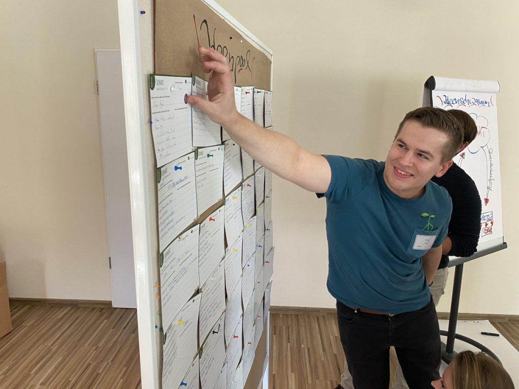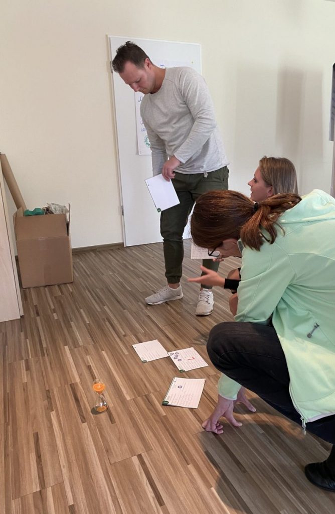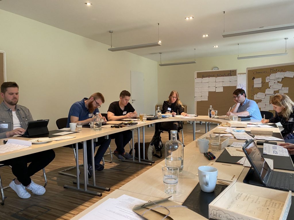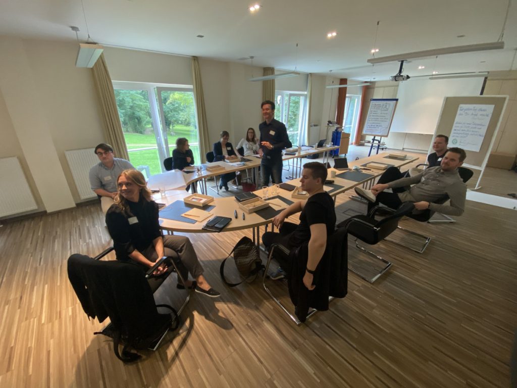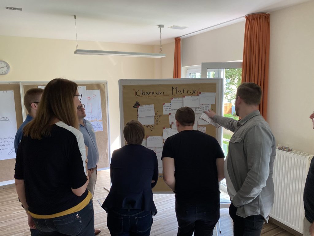 Neun Mitarbeiterinnen und Mitarbeiter aus sieben Abteilungen trafen sich auf Gut Gremmelin zur innoXperts® Ausbildung Interne:r Ideentrainer:in. Neben dem Einsatz des Edison-Prinzip®s erlernten sie Methoden für die Offline-Moderation von Gruppen und die Moderation der Ideenplattform OSPA Ideas für bevorstehende Online-Kampagnen.