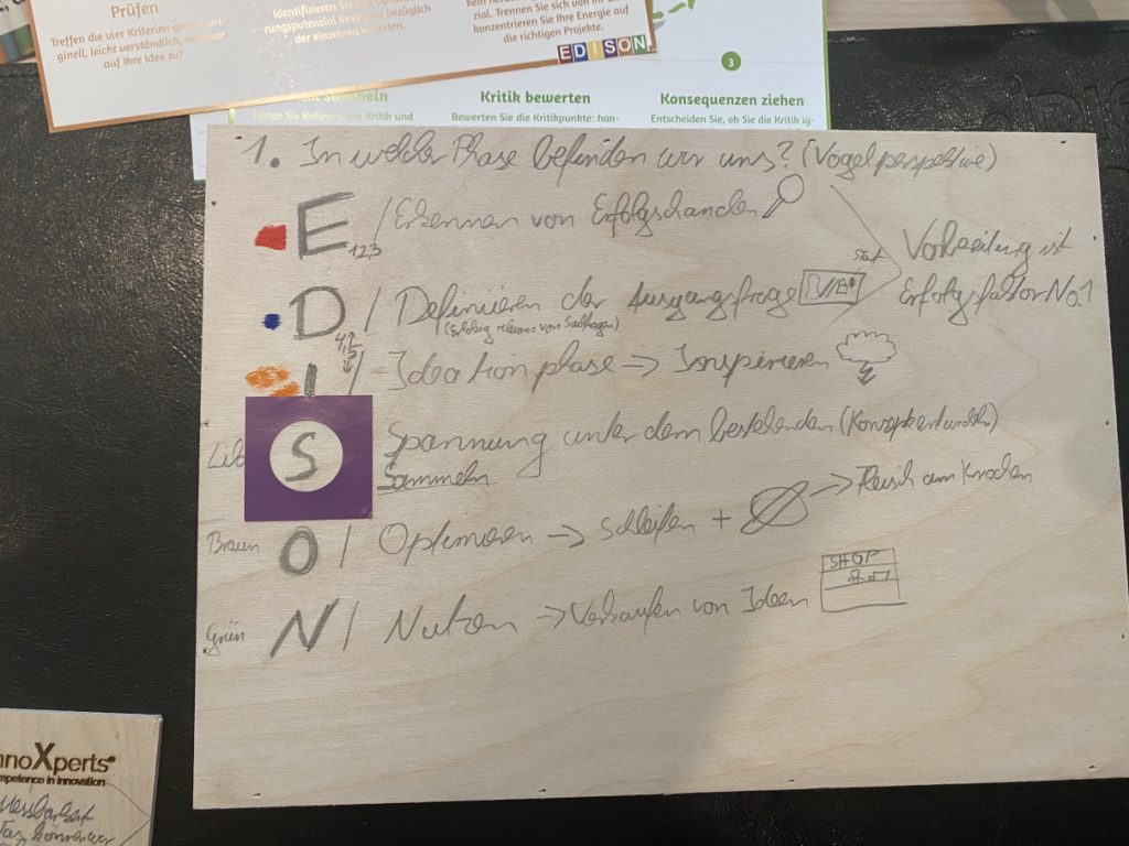 Die innoXperts® Ausbildung Interne:r Ideentrainer:in basiert auf dem Edison-Prinzip®, das in sechs strukturierten Schritten durch den Ideenentwicklungsprozess führt: Erkennen, Definieren, Inspirieren, Sammeln, Optimieren und Nutzen. Jede Phase enthält Methoden, die die unternehmerische Kreativität unterstützen und vorantreiben. Das Edison-Prinzip® ist ein zuverlässiger Werkzeugkasten für die Entwicklung und Umsetzung der besten Ideen. Die Kreativitätsmethoden sind schnell zu erlernen, die Toolbox typenoffen und jederzeit einsetzbar. Das Edison-Prinzip® liefert innerhalb kürzester Zeit messbare Ergebnisse.