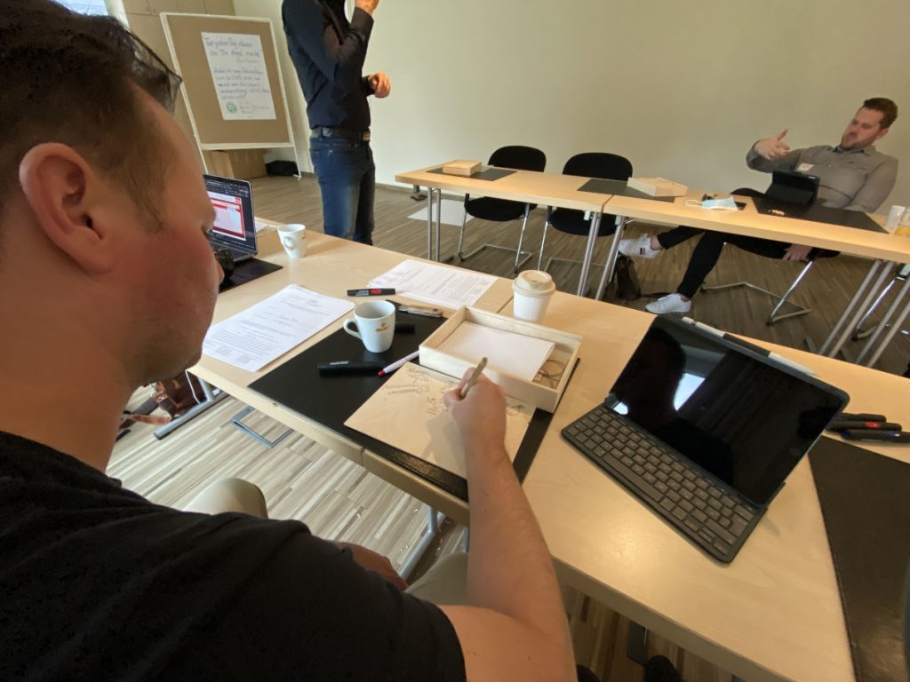 Die zukünftigen Internen Ideentrainerinnen und Ideentrainer entwickelten und präsentierten Ideen. Nach einer Selbstreflexion erhielten sie umfassendes Feedback sowohl von der Gruppe als auch vom Innovationsexperten und Coach Henryk Mioskowski, der als Unternehmer und Co-Entwickler des Edison-Prinzip®s sowie der Ausbildung Interne:r Ideentrainer:in, die Veranstaltung moderierte.